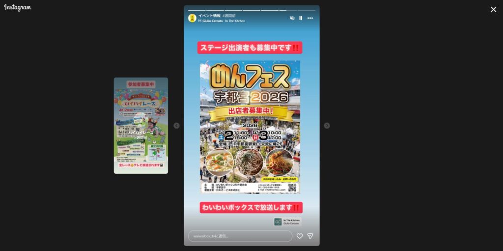今回のめんフェス宇都宮2026では、ステージイベント全体が『わいわいボックス』の公開収録として位置づけられており、出演パフォーマーのステージ映像が後日ダイジェスト形式でとちぎテレビで放映される予定です。わいわいボックスの公式Xもイベント告知を投稿しており、番組と連携したイベントであることが確認できます。
